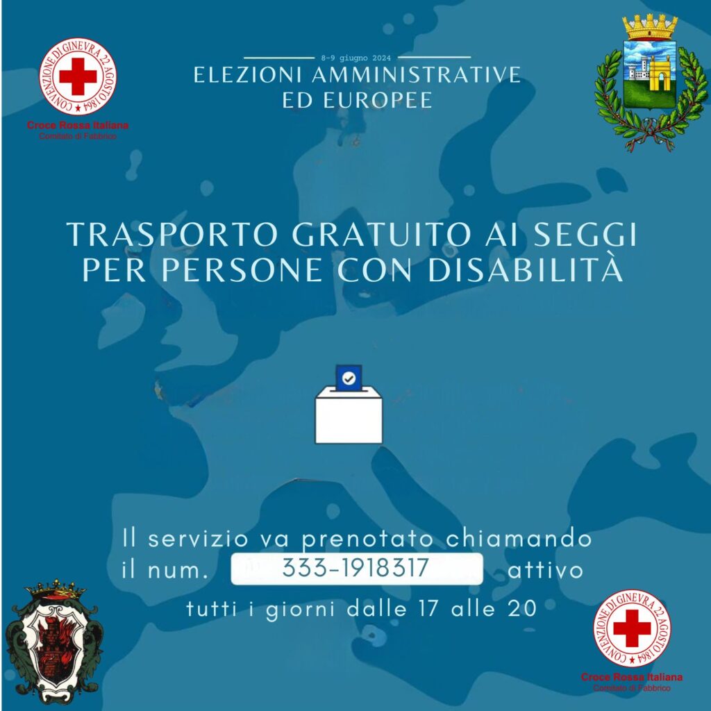 In occasione delle Elezioni Europee ed Amministrative dell’8 e 9 giugno 2024 sarà attivo un servizio gratuito di trasporto ai seggi delle persone disabili in carrozzina o comunque impossibilitate a salire su autovetture normali.