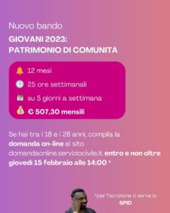 Per partecipare alla selezione occorre un'età compresa tra i 18 e i 28 anni; la compilazione della domanda è on-line, accedendo tramite Spid, entro le ore 14.00 di giovedì 22 febbraio: domandaonline.serviziocivile.it