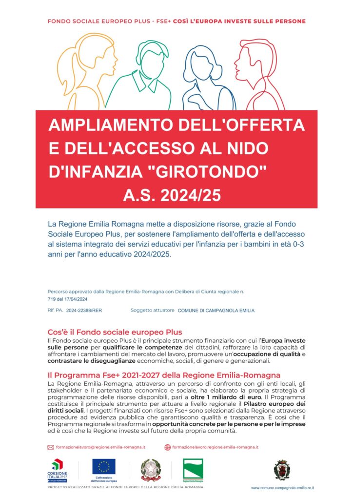 L’Amministrazione comunale di Campagnola Emilia ha ottenuto un finanziamento regionale a sostegno dell'ampliamento dell'offerta e dell'accesso al sistema integrato dei servizi educativi per l’infanzia per i bambini in età 0-3 anni per l’anno educativo 2024/2025, ai sensi della deliberazione della Giunta Regionale n. 719/2024, nell’ambito del PR FSE+ 2021/2027 Priorità 3. Inclusione sociale (CUP E21I24000200009 – PA. 2024-22388/RER). Grazie a questi fondi è stato possibile l'ampliamento di posti effettuato al Nido d'Infanzia "Girotondo"nel corrente a.s. 2024/2025.