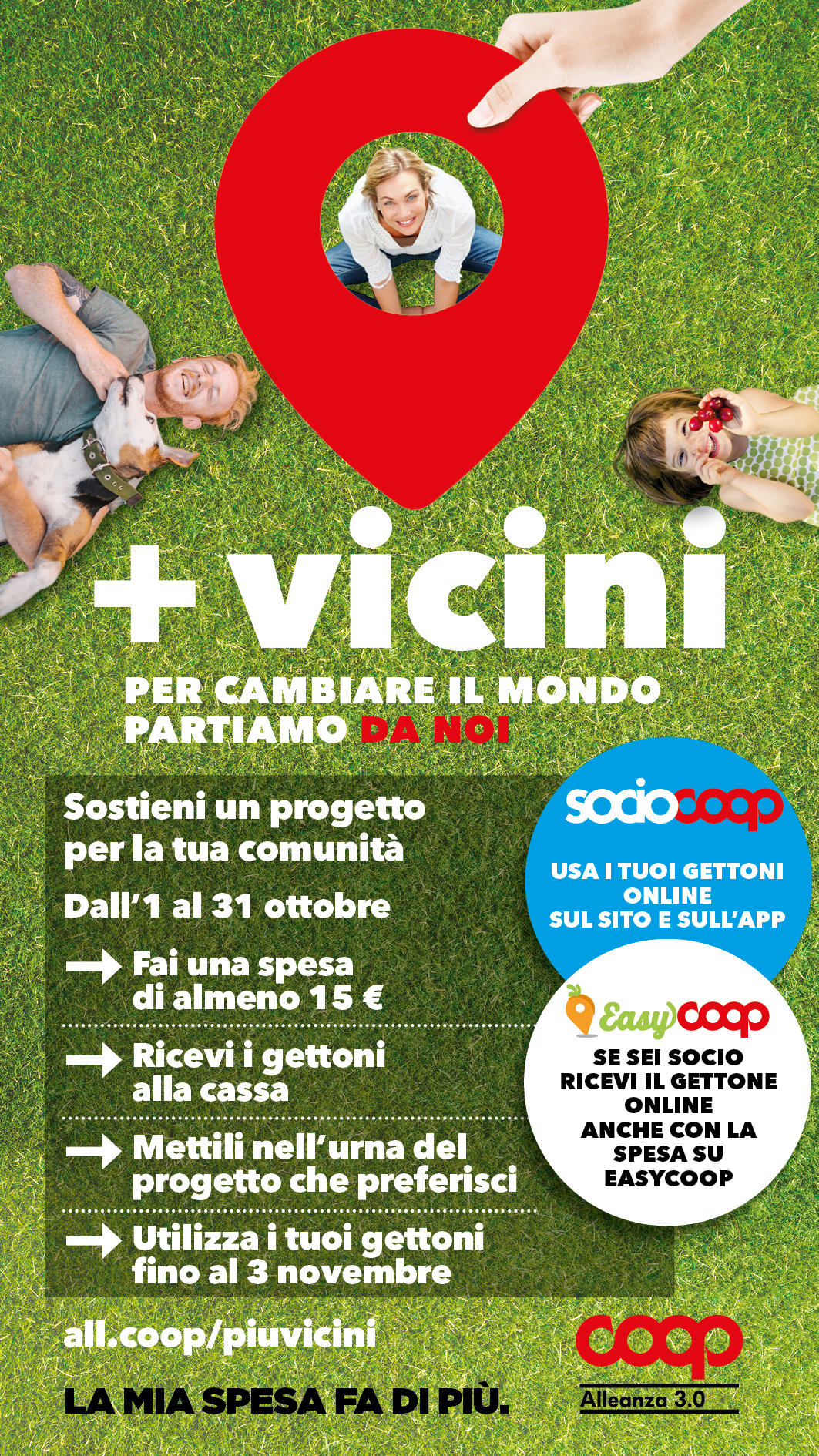 Nel mese di ottobre, in tutti i negozi di Coop Alleanza 3.0 ricevi un gettone ogni 15€ di spesa. Inserisci i gettoni nell’urna del progetto che vuoi sostenere. E se sei socia o socio Coop il gettone raddoppia: hai un gettone online sulla tua carta socio da utilizzare sul sito https://all.coop/piuvicini o sull’app. Avrai tempo fino al 3 novembre per utilizzare i gettoni cartacei e online per scegliere il progetto che ti sta più a cuore. Un gettone online anche ai soci che fanno la spesa su EasyCoop e EasyCoop PetStore.