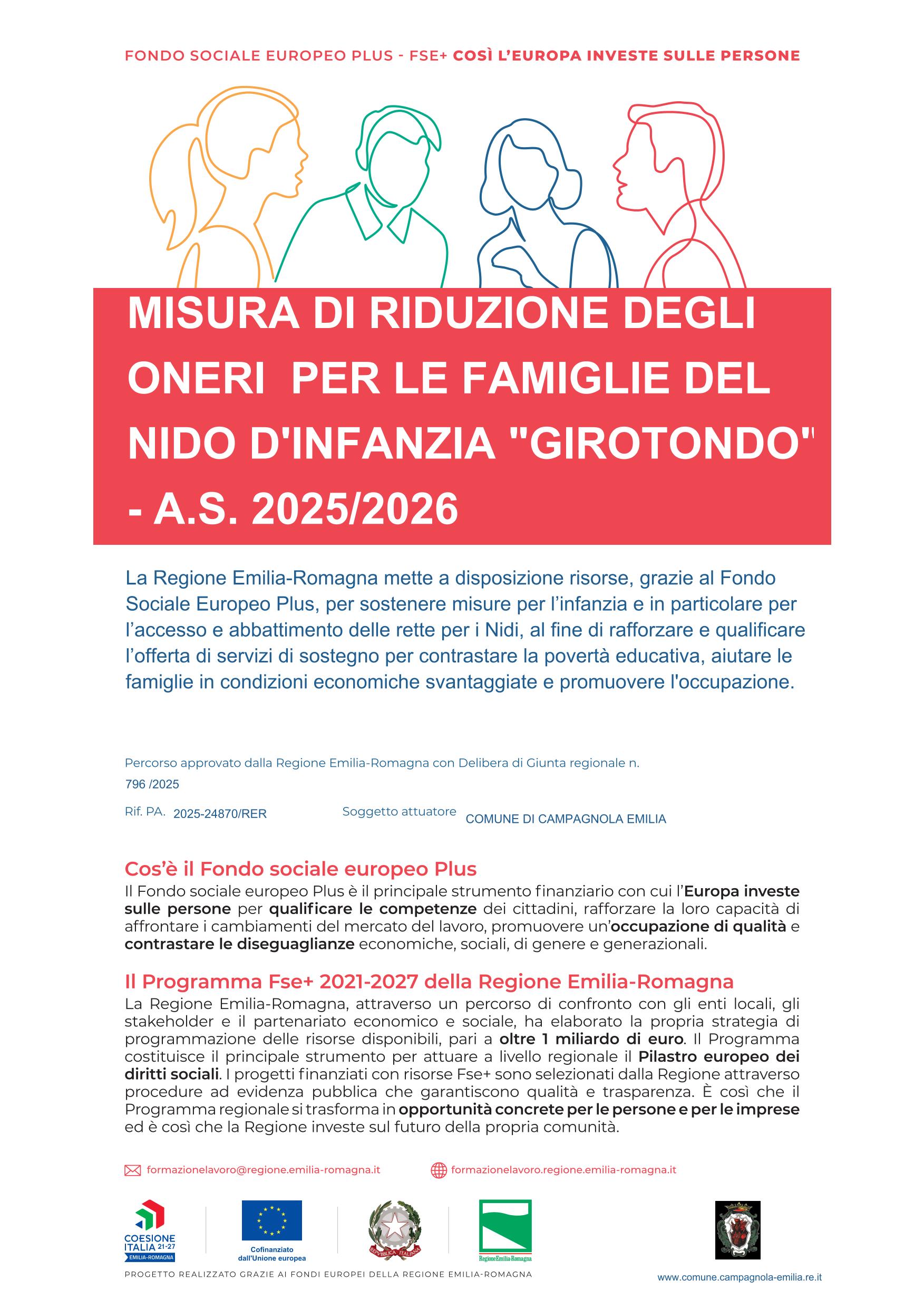 L’Amministrazione comunale di Campagnola Emilia, con deliberazione di Giunta Comunale nr. 111 del 29/09/2025 ha ridefinito il proprio sistema tariffario a seguito del finanziamento regionale per favorire l’accesso e ridurre gli oneri a carico delle famiglie ai servizi educativi per l’infanzia per i bambini in età 0-3 anni per l’anno educativo 2025/2026 come approvata con deliberazione della Giunta Regionale n. 796/2025, nell’ambito del PR FSE+ 2021/2027 Priorità 3. Inclusione sociale (CUP E21I25000170002 -   PA. 2025-24870/RER).