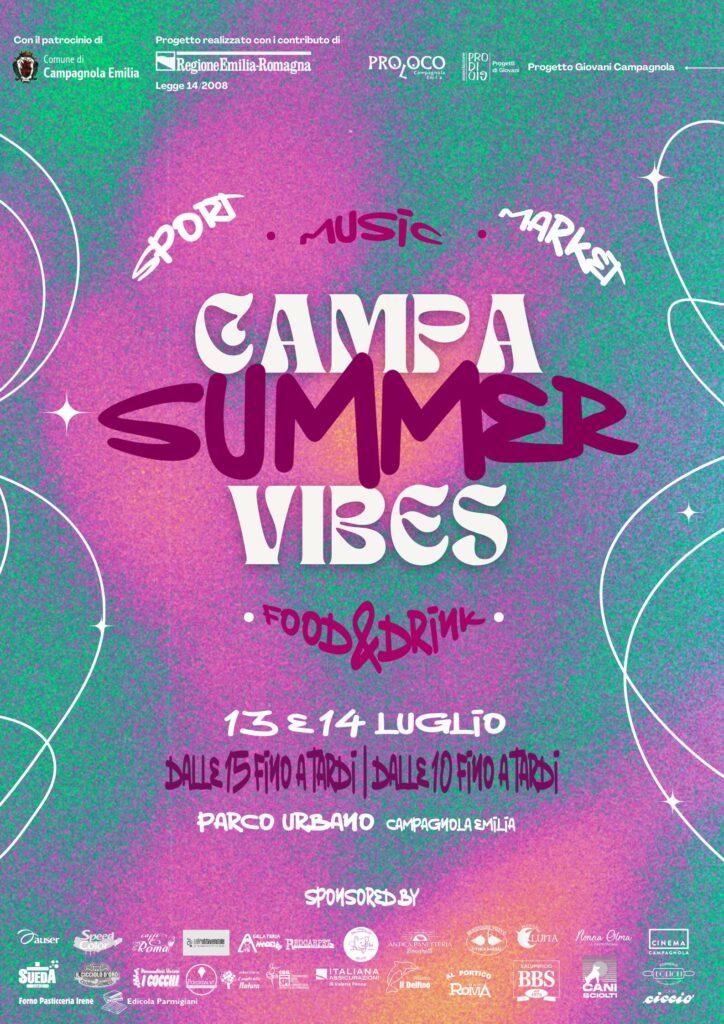 Il Progetto Giovani di Campagnola Emilia, nell'ambito dei finanziamenti della Legge 14/2008 della Regione Emilia Romagna ed in collaborazione con il Comune di Campagnola Emilia, Prodigio e Pro Loco, invita tutta la cittadinanza sabato 13 e domenica 14 luglio presso il Parco Urbano per il CAMPA SUMMER VIBES.