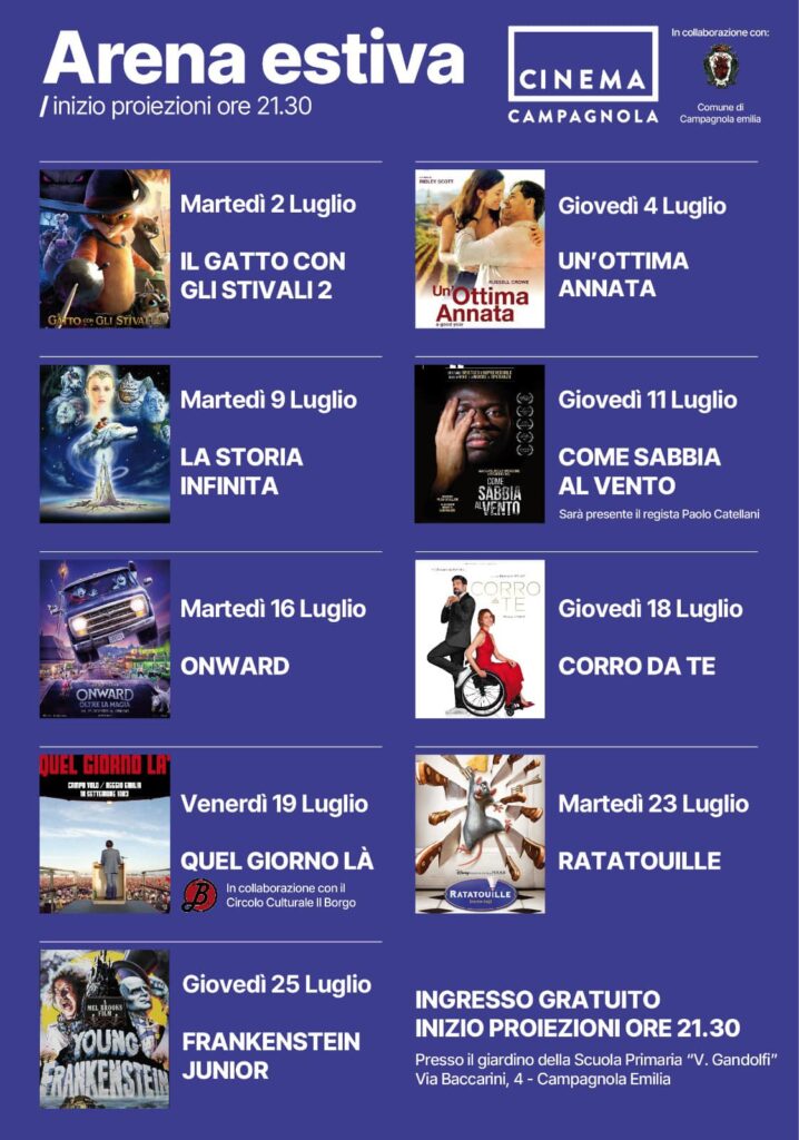 Anche per l'estate 2024 il Cinema dell'Oratorio San Giovanni Bosco, in collaborazione con il Comune di Campagnola Emilia, propone per il mese di luglio 9 appuntamenti con una rassegna di film per adulti e per bambini presso il cortile della Scuola Primaria.