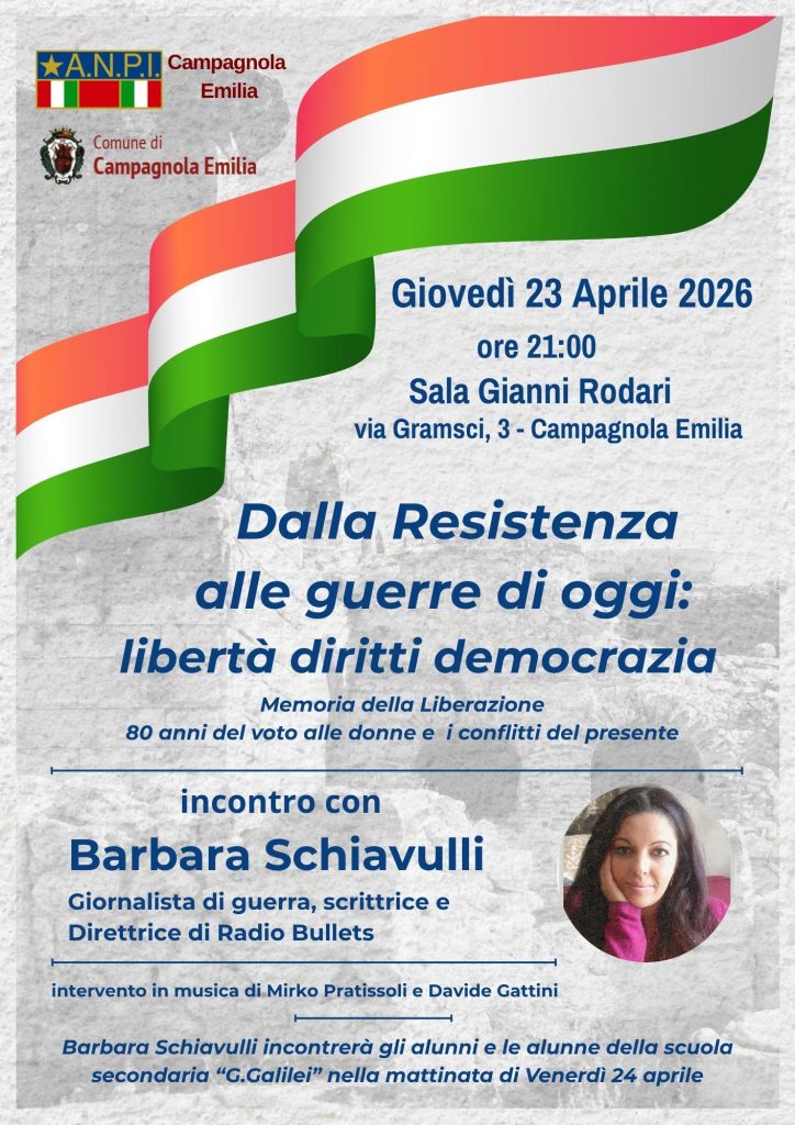 In occasione delle celebrazioni per l' ottantunesimo anniversario della Liberazione, la sezione Anpi di Campagnola Emilia con il patrocinio del Comune, ha organizzato due importanti appuntamenti con la giornalista Barbara Schiavulli: