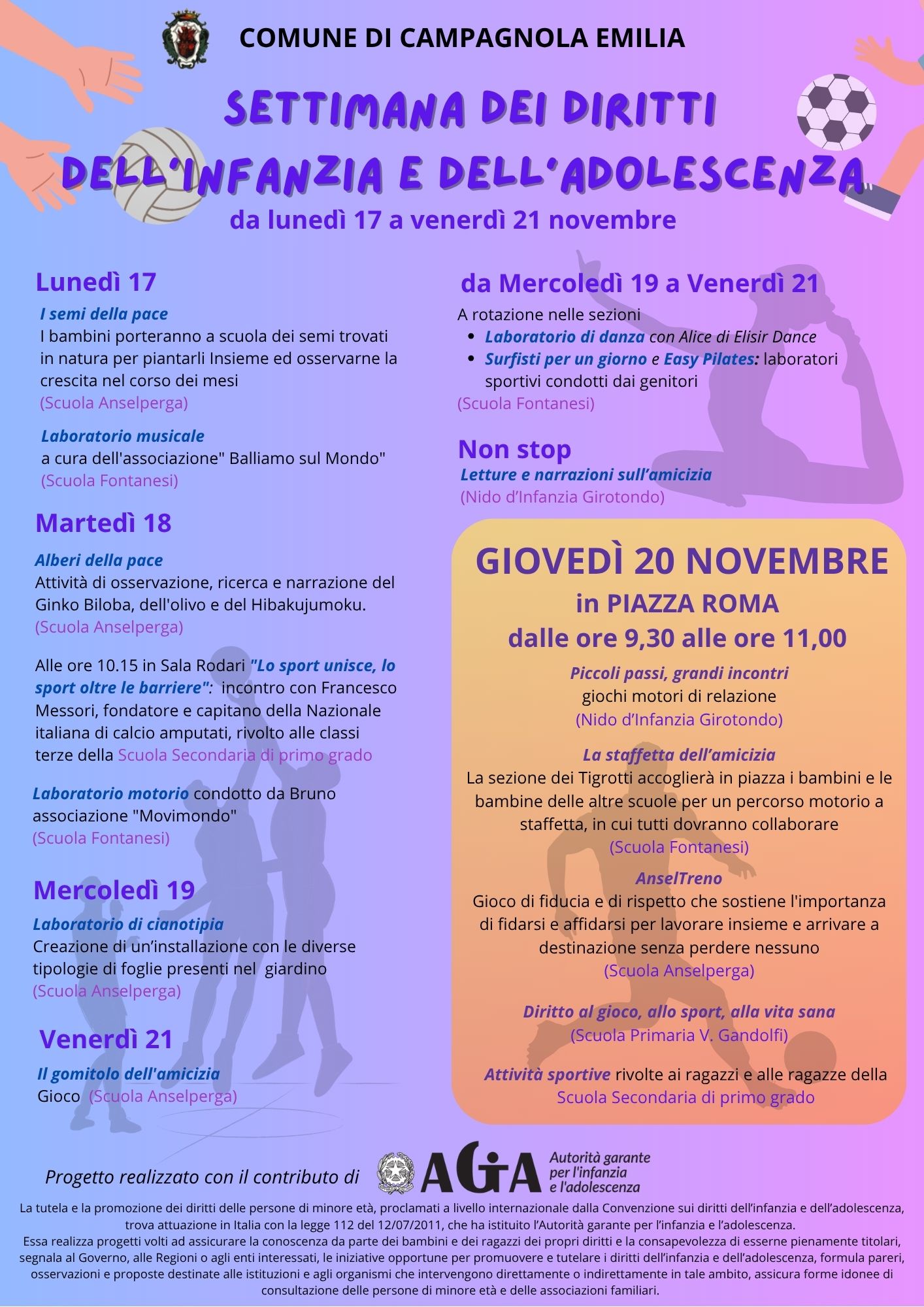 Tutte le Scuole di Campagnola Emilia si incontrano in Piazza Roma per celebrare la giornata mondiale dei diritti dell'infanzia e dell'adolescenza, con giochi e attività sportive.