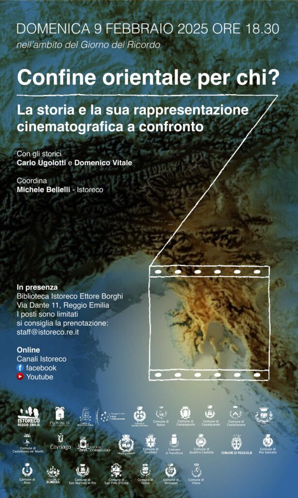 Domenica 9 febbraio alle ore 18,30 , in presenza e online, Istoreco e gli enti locali reggiani propongono il convegno “Confine orientale per chi? La storia e la sua rappresentazione cinematografica a confronto”, organizzato per celebrare il Giorno del Ricordo, con gli storici Carlo Ugolotti e Domenico Vitale, con coordinamento di Michele Bellelli.