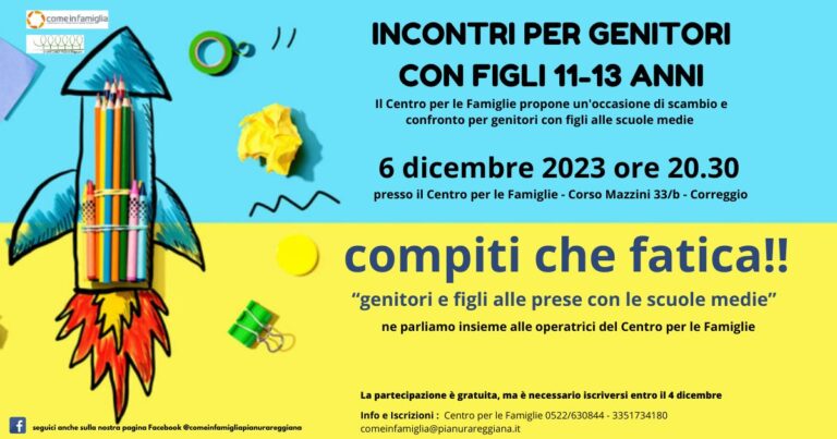 MERCOLEDI’ 6 DICEMBRE 2023 alle ore 20.30 – COMPITI CHE FATICA, presso il Centro per le Famiglie