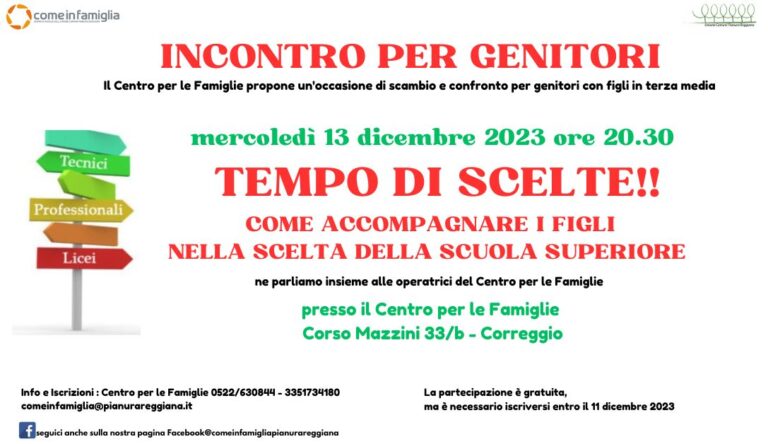 MERCOLEDI’ 13 DICEMBRE 2023 alle ore 20.30 – TEMPO DI SCELTE, come accompagnare i figli nella scelta della scuola superiore, presso il Centro per le Famiglie