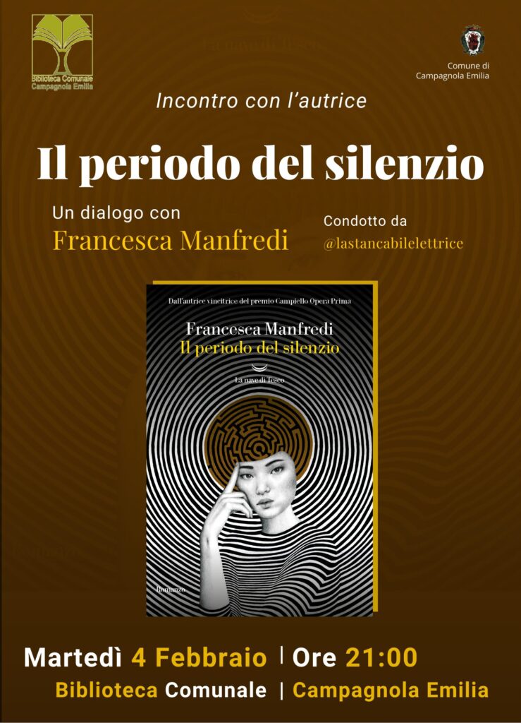 La Biblioteca ospita la scrittrice Francesca Manfredi, martedì 4 febbraio alle 21.00, per la presentazione del suo ultimo romanzo, Il periodo del silenzio, edito da La nave di Teseo, con la quale ha pubblicato anche la raccolta di racconti Un buon posto dove stare (2017) -con cui ha vinto il premio Campiello Opera Prima- e il romanzo L'impero della polvere (2019), finalista al Premio Dolores Prato.