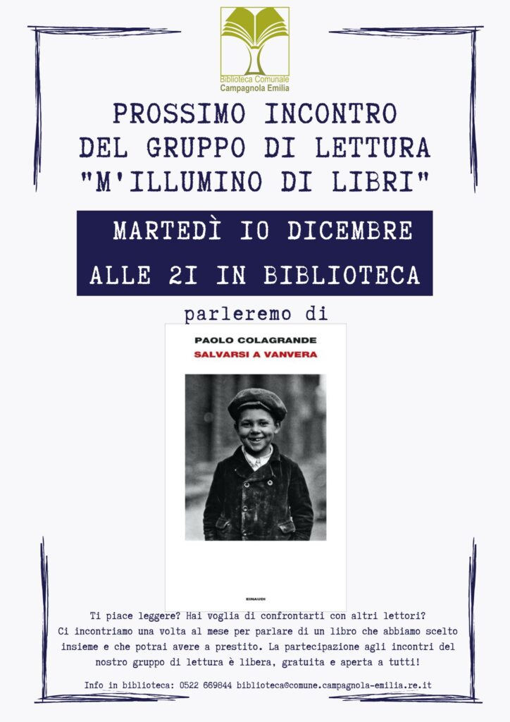 Per l'undicesimo appuntamento del 2024 del Gruppo di lettura "M'illumino di libri" della Biblioteca Comunale condivideremo le impressioni sul libro Salvarsi a vanvera, di Paolo Colagrande, Einaudi edizioni, le cui copie sono disponibili per il prestito in Biblioteca.