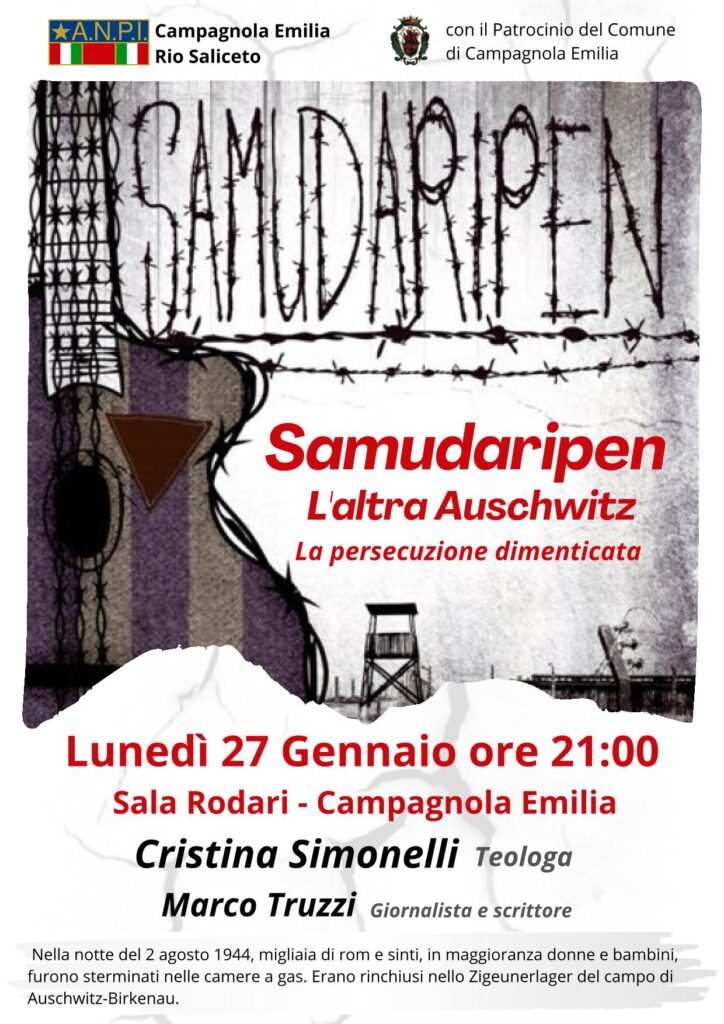 Anpi di Campagnola Emilia e Rio Saliceto, con il patrocinio del Comune di Campagnola Emilia, invita tutta la cittadinanza all'incontro con la teologa Cristina Simonelli ed il giornalista Marco Truzzi su "Samudaripen", termine usato per indicare lo sterminio delle popolazioni romanì (Rom, Sinti, Manush, Kalè e altre con diverse autodeterminazioni) perpetrato dalla Germania nazista e dai paesi dell'Asse durante la seconda guerra mondiale.